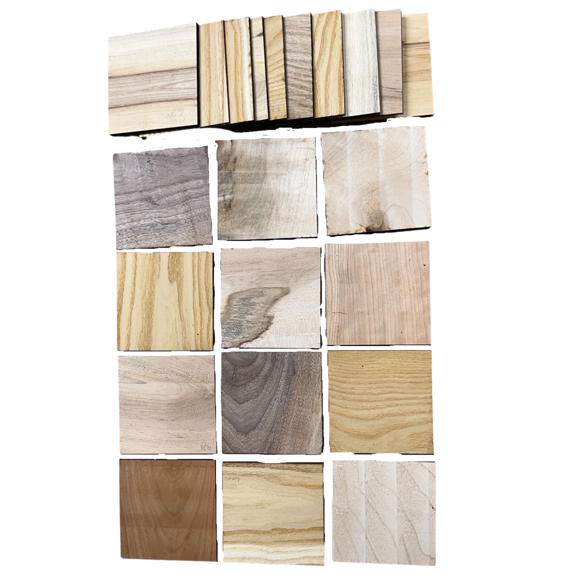 A sampling of our laser ready sheets of hardwood. Each cube contains a mix of quarter and eighth inch thick pieces that are 4 x 4 inches big. Each code contains a random assortment of thicknesses and species that were milled at Makers Workshop. Each 4×4 cube contains between 14 and 30 pieces depending on thickness. Each cube will contain a minimum of three different species, often times more than three.